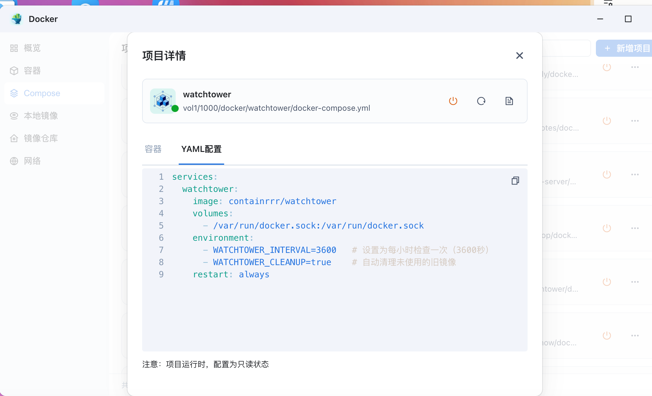 Watchtower 需要访问 Docker 的 socket(通过 /var/run/docker.sock),这意味着它需要足够的权限与 Docker 引擎进行交互。确保你信任 Watchtower,并了解它所拥有的权限。